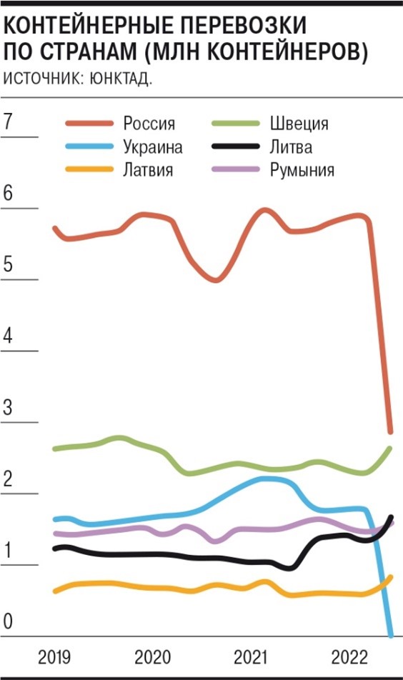 Моделирование ЮНКТАД показывает, что высокие затраты на контейнерные перевозки приведут к дополнительному увеличению мировой инфляции на 1,6% и к росту мировых цен на импортные товары на 11,9%. Объем перевозок, выраженный в TEU (стандартные 20-футовые контейнеры), резко сократился: с 5,9 млн до 2,9 млн у РФ и с 1,8 млн до нуля — у Украины. Суда, которые перенаправлялись из российских и украинских портов, сейчас скапливаются в Гамбурге, Роттердаме, Констанце и Стамбуле, что задерживает поставки и может привести к росту сборов за задержки и простои в портах.